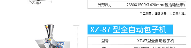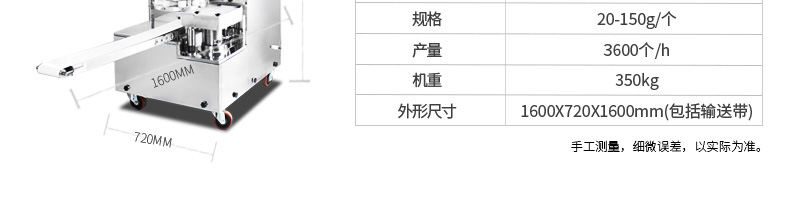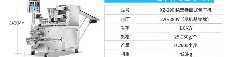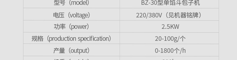 名稱BZ-30型單餡斗包子機(jī) 電源220/380V(見機(jī)器名牌) 功率2.5kw 產(chǎn)量1800個(gè)/小時(shí) 尺寸1440*680*1470mm 重量300kg 規(guī)格25-100克/個(gè) 其他