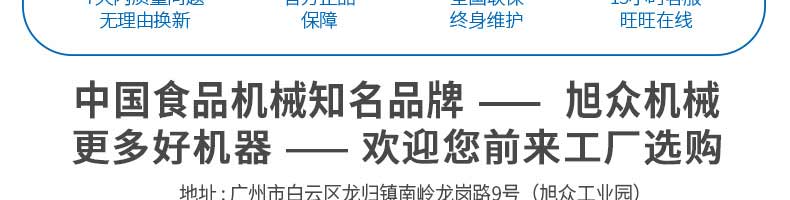 廣州旭眾食品機械有限公司是一家集科研開發(fā),生產設計,營銷服務為一體的現(xiàn)代化生產企業(yè)。現(xiàn)代化生產車間,精湛制造技術,所產機械歷經市場重重考驗,不斷贏得海內外客戶的贊譽。