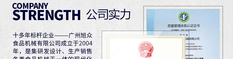廣州旭眾食品機械有限公司是一家集科研開發(fā),生產(chǎn)設計,營銷服務為一體的現(xiàn)代化生產(chǎn)企業(yè)。現(xiàn)代化生產(chǎn)車間,精湛制造技術(shù),所產(chǎn)機械歷經(jīng)市場重重考驗,不斷贏得海內(nèi)外客戶的贊譽。