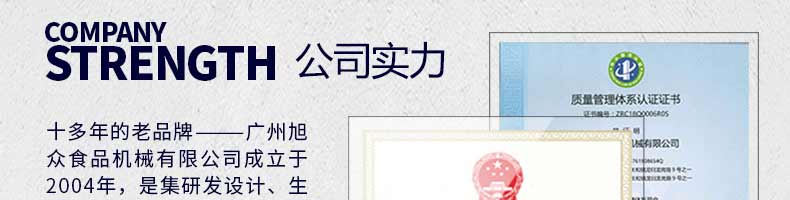 廣州旭眾食品機械有限公司是一家集科研開發(fā),生產(chǎn)設計,營銷服務為一體的現(xiàn)代化生產(chǎn)企業(yè)。現(xiàn)代化生產(chǎn)車間,精湛制造技術,所產(chǎn)機械歷經(jīng)市場重重考驗,不斷贏得海內(nèi)外客戶的贊譽。