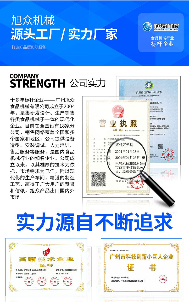 廣州旭眾食品機(jī)械有限公司是一家集科研開發(fā),生產(chǎn)設(shè)計(jì),營(yíng)銷服務(wù)為一體的現(xiàn)代化生產(chǎn)企業(yè)。現(xiàn)代化生產(chǎn)車間,精湛制造技術(shù),所產(chǎn)機(jī)械歷經(jīng)市場(chǎng)重重考驗(yàn),不斷贏得海內(nèi)外客戶的贊譽(yù)。