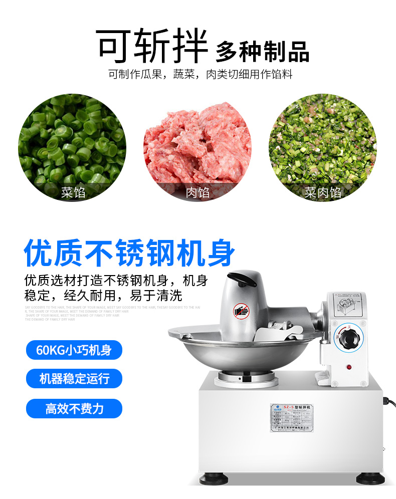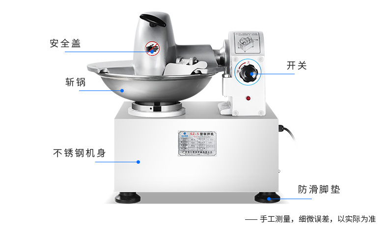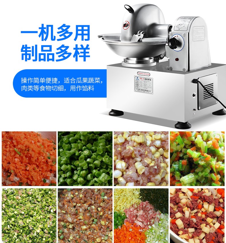 SZ-5型斬拌機,全自動斬拌機,高效安全、節(jié)能便捷、適用于制作各種餡料??蓴匕瓒喾N制品,可制作瓜果,蔬菜,肉類切細用作餡料。優(yōu)質選材打造不銹鋼機身,機身穩(wěn)定,經久耐用,易于清洗。