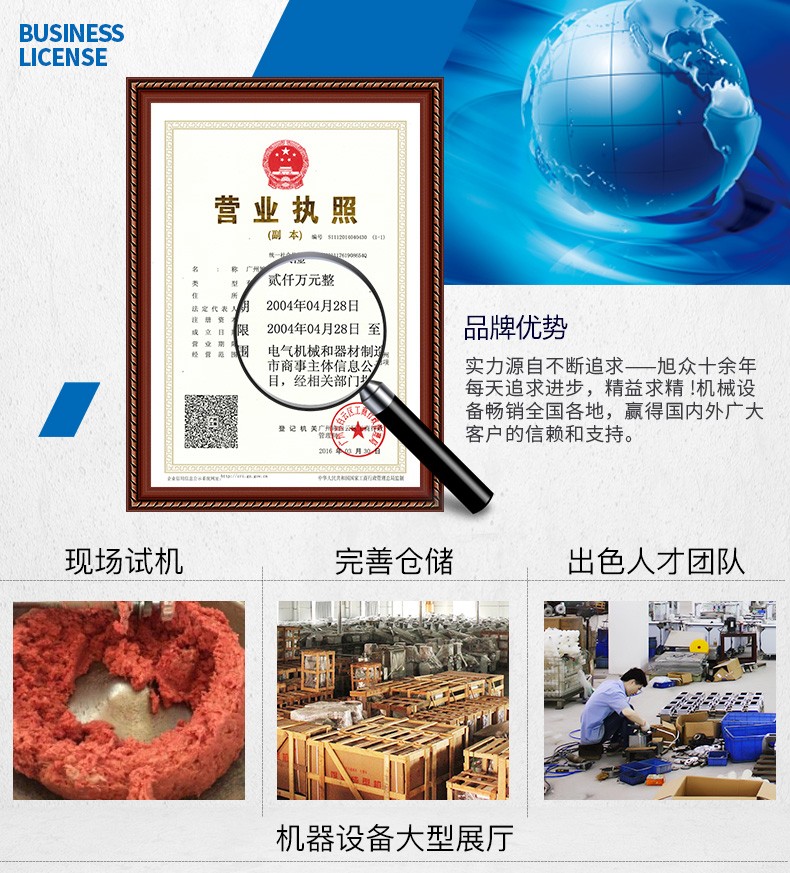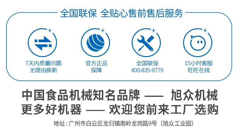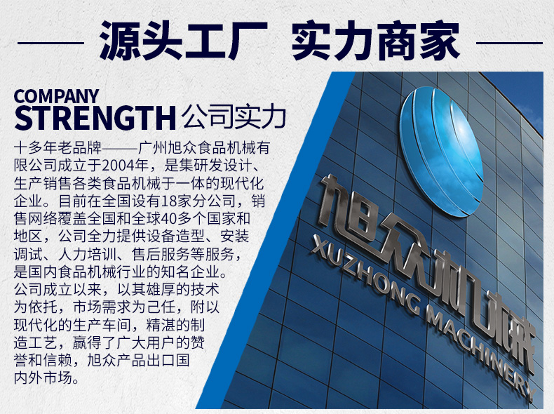 廣州旭眾食品機械有限公司是一家集科研開發(fā),生產設計,營銷服務為一體的現(xiàn)代化生產企業(yè)?,F(xiàn)代化生產車間,精湛制造技術,所產機械歷經市場重重考驗,不斷贏得海內外客戶的贊譽。