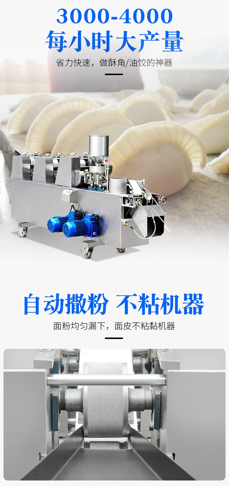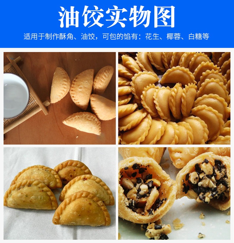 自動(dòng)成型油餃機(jī),創(chuàng)業(yè)商用、省時(shí)省力。適用于制作酥角、油餃。3000-4000每小時(shí)大產(chǎn)量。省力快速,做酥角、油餃的神器。自動(dòng)撒粉 不粘機(jī)器。面粉均勻漏下,面皮不粘黏機(jī)器。