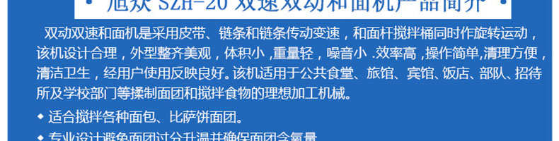SZH-20型雙速雙動(dòng)和面機(jī),本機(jī)適合攪拌各種面包、包子、饅頭、湯圓、披薩餅面團(tuán),專(zhuān)業(yè)設(shè)計(jì)避免面團(tuán)過(guò)分升溫并確保面團(tuán)含氧量。過(guò)載、缺相保護(hù)裝置,防護(hù)罩安全連動(dòng)裝置。