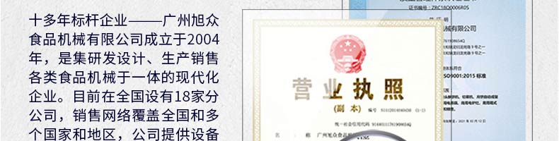 廣州旭眾食品機(jī)械有限公司是一家集科研開(kāi)發(fā),生產(chǎn)設(shè)計(jì),營(yíng)銷(xiāo)服務(wù)為一體的現(xiàn)代化生產(chǎn)企業(yè)?,F(xiàn)代化生產(chǎn)車(chē)間,精湛制造技術(shù),所產(chǎn)機(jī)械歷經(jīng)市場(chǎng)重重考驗(yàn),不斷贏得海內(nèi)外客戶(hù)的贊譽(yù)。