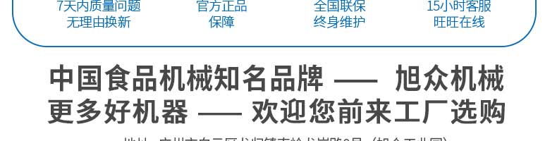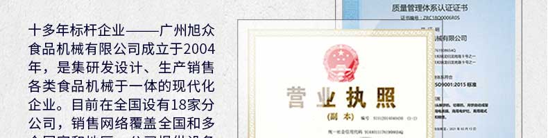 廣州旭眾食品機(jī)械有限公司是一家集科研開(kāi)發(fā),生產(chǎn)設(shè)計(jì),營(yíng)銷(xiāo)服務(wù)為一體的現(xiàn)代化生產(chǎn)企業(yè)?,F(xiàn)代化生產(chǎn)車(chē)間,精湛制造技術(shù),所產(chǎn)機(jī)械歷經(jīng)市場(chǎng)重重考驗(yàn),不斷贏得海內(nèi)外客戶的贊譽(yù)。