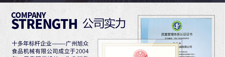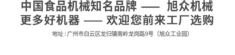廣州旭眾食品機械有限公司是一家集科研開發(fā),生產(chǎn)設(shè)計,營銷服務為一體的現(xiàn)代化生產(chǎn)企業(yè)?,F(xiàn)代化生產(chǎn)車間,精湛制造技術(shù),所產(chǎn)機械歷經(jīng)市場重重考驗,不斷贏得海內(nèi)外客戶的贊譽。