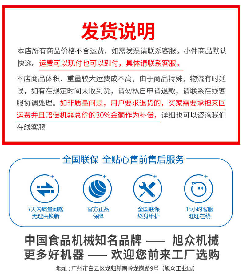 廣州旭眾食品機械有限公司是一家集科研開發(fā),生產(chǎn)設計,營銷服務為一體的現(xiàn)代化生產(chǎn)企業(yè)?,F(xiàn)代化生產(chǎn)車間,精湛制造技術(shù),所產(chǎn)機械歷經(jīng)市場重重考驗,不斷贏得海內(nèi)外客戶的贊譽。
