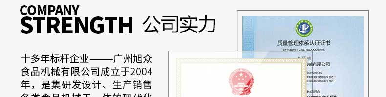 廣州旭眾食品機(jī)械有限公司是一家集科研開發(fā),生產(chǎn)設(shè)計(jì),營(yíng)銷服務(wù)為一體的現(xiàn)代化生產(chǎn)企業(yè)?,F(xiàn)代化生產(chǎn)車間,精湛制造技術(shù),所產(chǎn)機(jī)械歷經(jīng)市場(chǎng)重重考驗(yàn),不斷贏得海內(nèi)外客戶的贊譽(yù)。