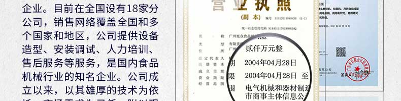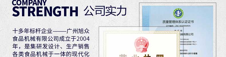 廣州旭眾食品機械有限公司是一家集科研開發(fā),生產設計,營銷服務為一體的現代化生產企業(yè)。現代化生產車間,精湛制造技術,所產機械歷經市場重重考驗,不斷贏得海內外客戶的贊譽。