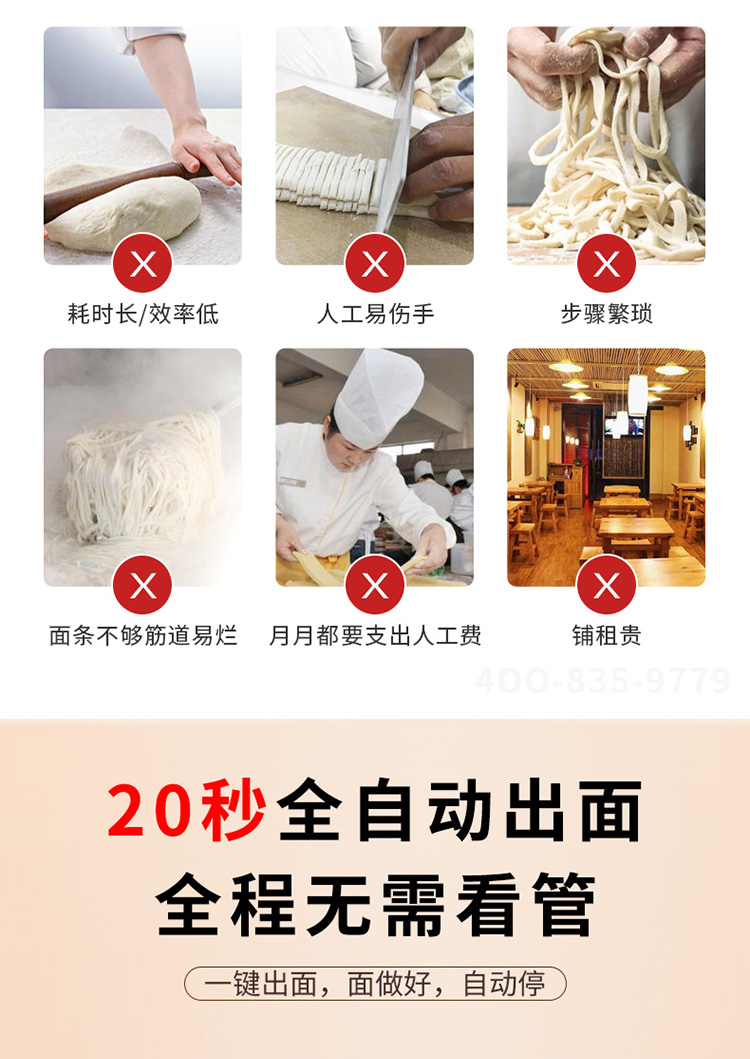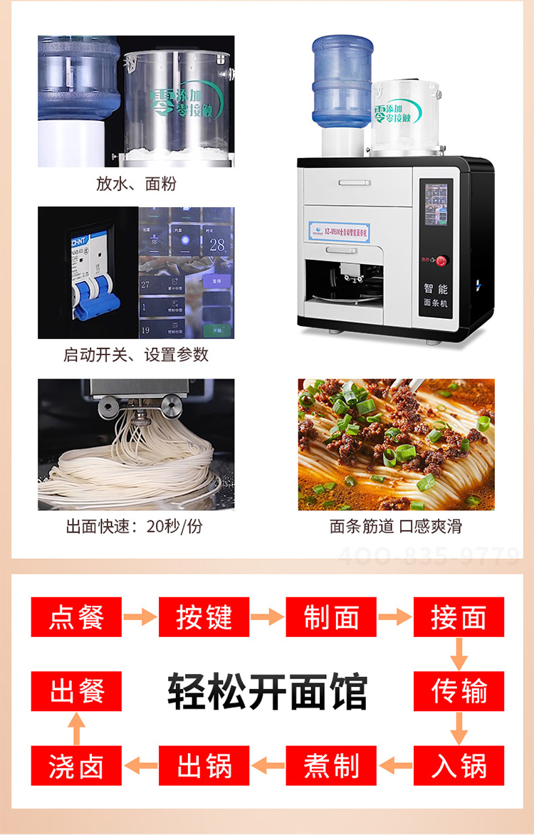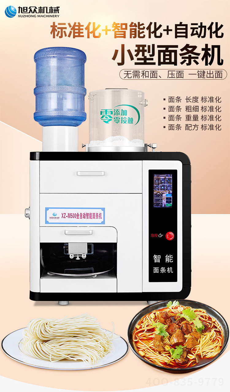 全自動商用快速出面電動素面濕面M500臺式制面機器,20秒全自動出面,全程無需看管。一鍵出面,面做好,自動停。均勻滴漏加水系統(tǒng),水面比例把握更好。自動滴漏加水系統(tǒng),運作過程加水更均勻,適量控水,面條更有嚼勁。
