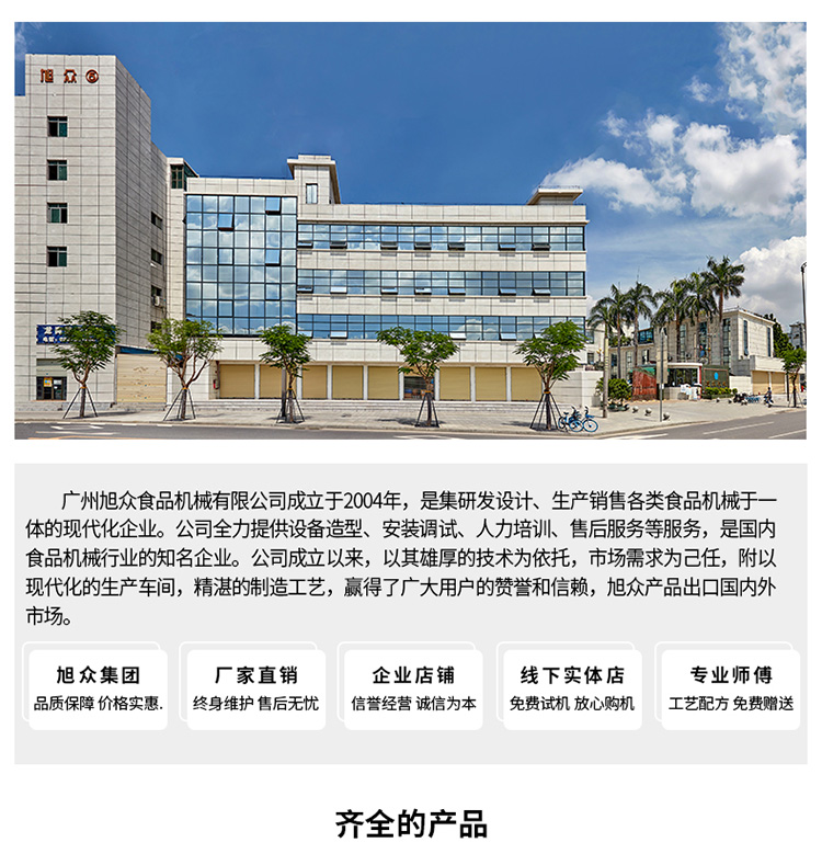 廣州旭眾食品機械有限公司是一家集科研開發(fā),生產(chǎn)設計,營銷服務為一體的現(xiàn)代化生產(chǎn)企業(yè)?,F(xiàn)代化生產(chǎn)車間,精湛制造技術,所產(chǎn)機械歷經(jīng)市場重重考驗,不斷贏得海內外客戶的贊譽。