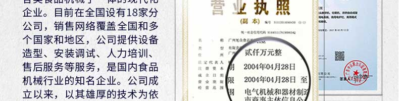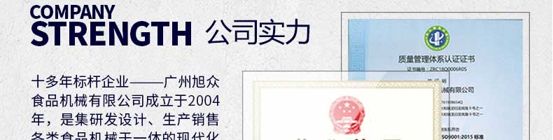 廣州旭眾食品機械有限公司是一家集科研開發(fā),生產(chǎn)設(shè)計,營銷服務為一體的現(xiàn)代化生產(chǎn)企業(yè)?,F(xiàn)代化生產(chǎn)車間,精湛制造技術(shù),所產(chǎn)機械歷經(jīng)市場重重考驗,不斷贏得海內(nèi)外客戶的贊譽。