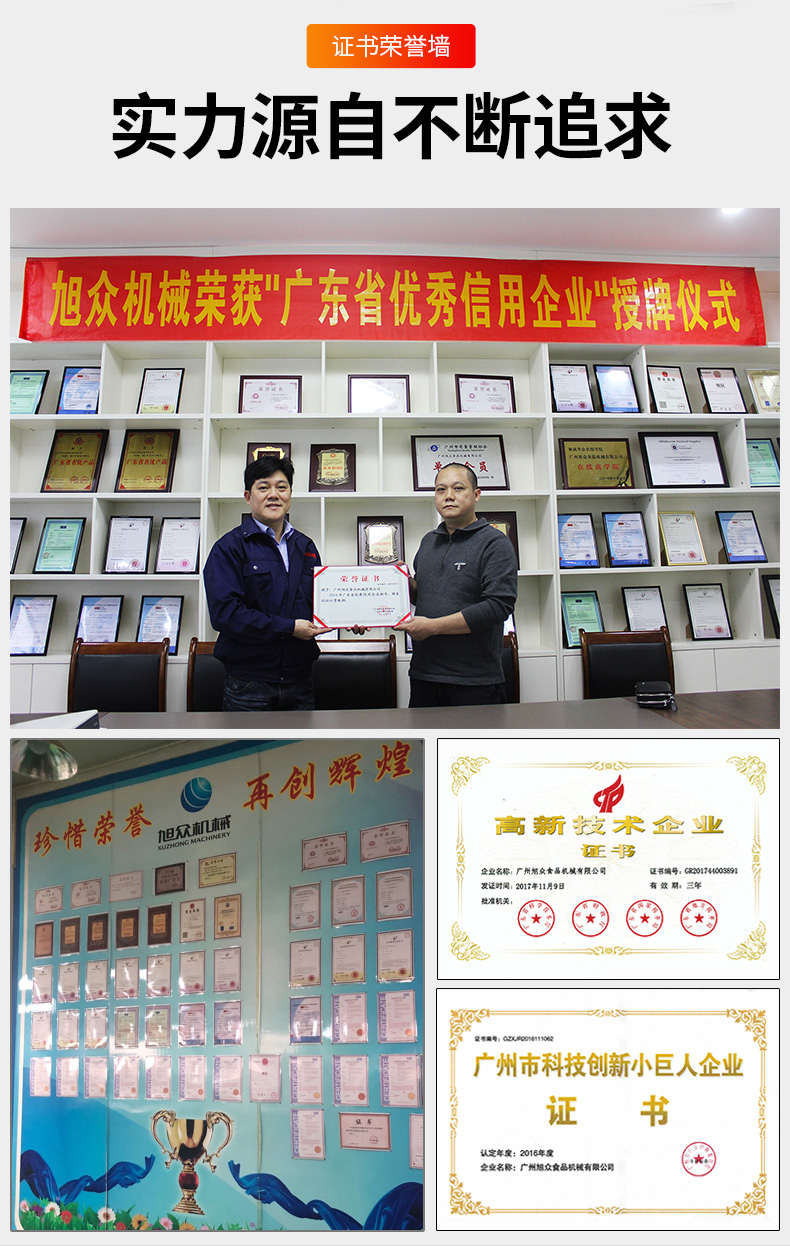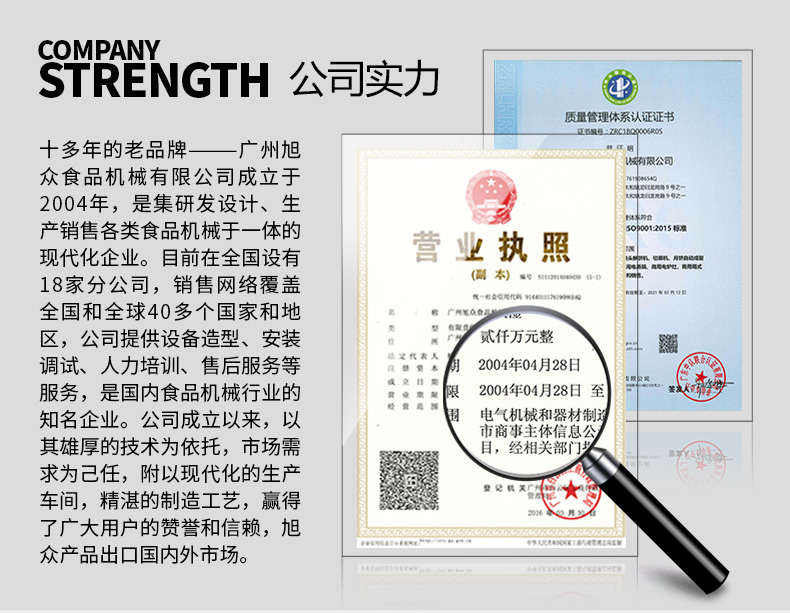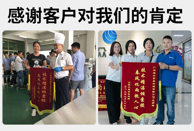 廣州旭眾食品機(jī)械有限公司是一家集科研開發(fā),生產(chǎn)設(shè)計,營銷服務(wù)為一體的現(xiàn)代化生產(chǎn)企業(yè)。現(xiàn)代化生產(chǎn)車間,精湛制造技術(shù),所產(chǎn)機(jī)械歷經(jīng)市場重重考驗,不斷贏得海內(nèi)外客戶的贊譽(yù)。