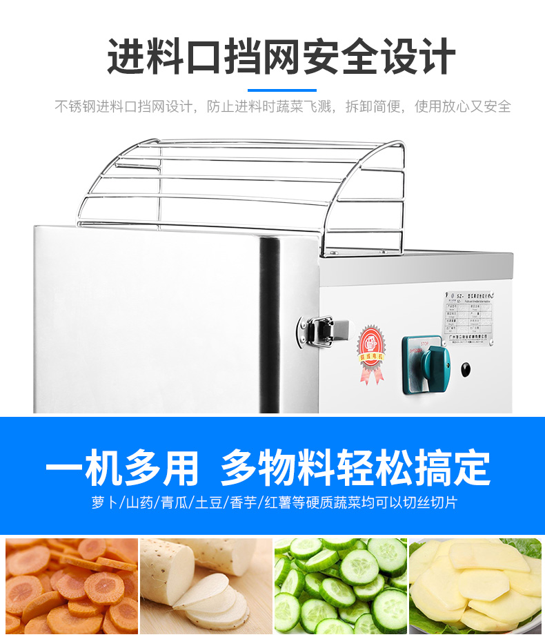 300型瓜果切絲切片機(jī),高效便捷、一次成型、每小時(shí)可切200-300KG。全不銹鋼機(jī)身經(jīng)久耐用小巧機(jī)身,方便移動(dòng)使用,時(shí)尚美觀,堅(jiān)固耐用。鋒利刀片、一次成型。電鍍防銹刀盤搭配不銹鋼刀片,輕輕松松應(yīng)對(duì)各種硬質(zhì)瓜果。