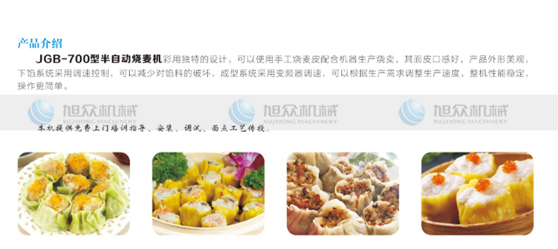 JGB-700燒麥機,采用特的設計,可以使用手工燒麥皮配合機器生產(chǎn)燒賣,其面皮口感好,產(chǎn)品外形美觀下餡系統(tǒng)采用調(diào)速控制,可以減少對餡料的破壞,成型系統(tǒng)呆用變頻器調(diào)速,可以根據(jù)生產(chǎn)需求調(diào)整生產(chǎn)速度,整機性能穩(wěn)定操作更簡單