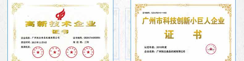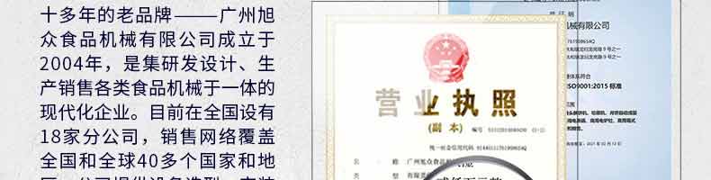 廣州旭眾食品機(jī)械有限公司是一家集科研開發(fā),生產(chǎn)設(shè)計(jì),營銷服務(wù)為一體的現(xiàn)代化生產(chǎn)企業(yè)?,F(xiàn)代化生產(chǎn)車間,精湛制造技術(shù),所產(chǎn)機(jī)械歷經(jīng)市場重重考驗(yàn),不斷贏得海內(nèi)外客戶的贊譽(yù)。