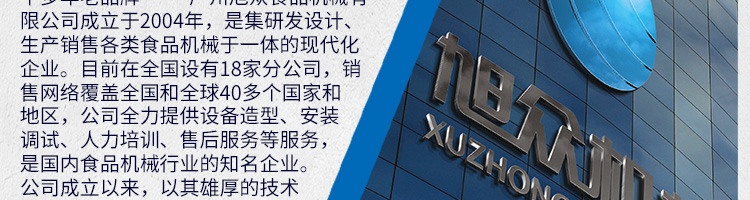 廣州旭眾食品機械有限公司是一家集科研開發(fā),生產(chǎn)設(shè)計,營銷服務(wù)為一體的現(xiàn)代化生產(chǎn)企業(yè)?,F(xiàn)代化生產(chǎn)車間,精湛制造技術(shù),所產(chǎn)機械歷經(jīng)市場重重考驗,不斷贏得海內(nèi)外客戶的贊譽。